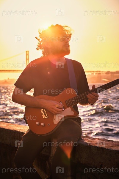 Хипстерский уличный музыкант в черном играет на электрической гитаре снаружи при закате солнца на прогулке с мостом 25 апреля на заднем плане