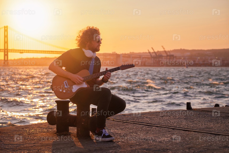 Хипстерский уличный музыкант в черном играет на электрической гитаре снаружи при закате