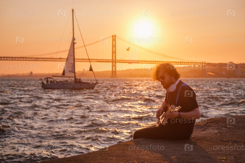 Хипстерский уличный музыкант в черном играет на электрической гитаре снаружи при закате солнца на прогулке с мостом 25 апреля и яхтой на заднем плане