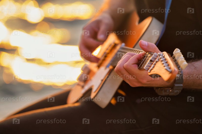 Уличный музыкант, играющий на электрической гитаре с помощью своей гитары приближается к воде на заднем плане