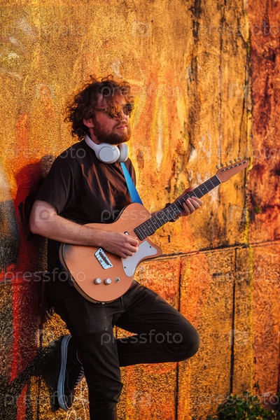 Хипстерский уличный музыкант в черном играет на электрической гитаре снаружи при закате, опираясь на покрашенную стену