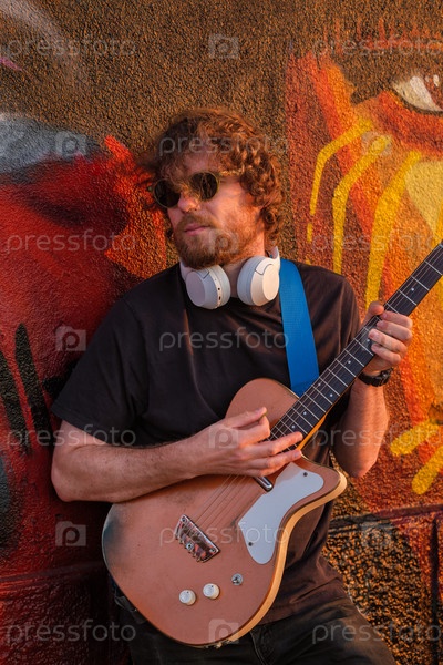 Хипстерский уличный музыкант в черном играет на электрической гитаре снаружи при закате, опираясь на покрашенную стену