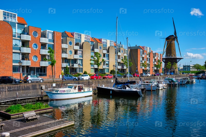 Вид на гавань Делфшавена со старой зерновой мельницей, известной как De Destillerketel.Роттердам, Нидерланды