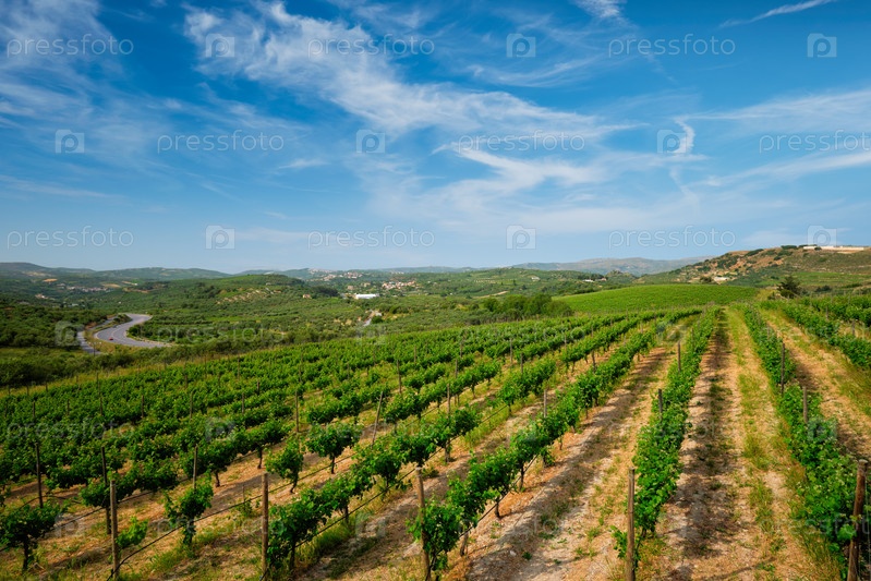Виноградник с виноградными рядами.Остров Крит, Греция