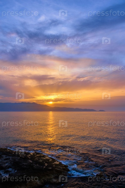 Морской закат с драматическим морским пейзажем.Остров Крит, Греция
