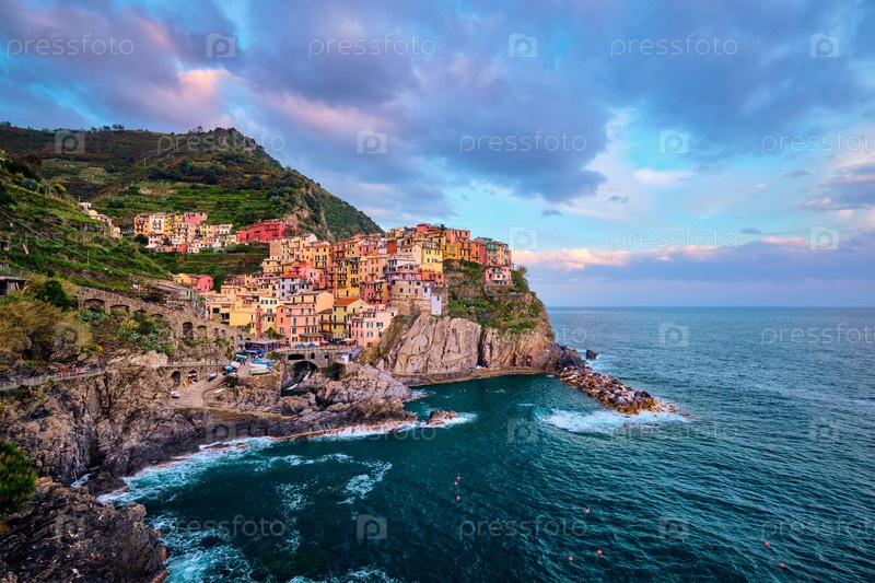 Деревня Манарола - популярное европейское итальянское туристическое направление в Национальном парке Цинк-Терре, объекте Всемирного наследия ЮНЕСКО, Лигурия, Италия при закате