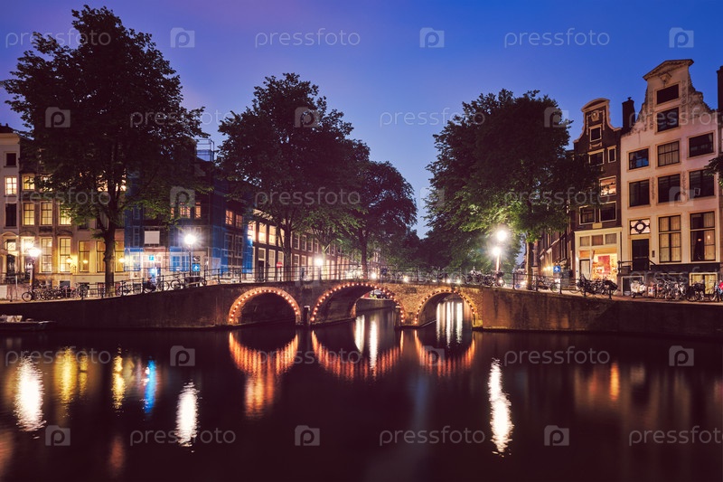 Амтердамский канал, мост и средневековые дома вечером