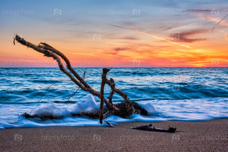 Ствол дерева в воде на тропическом пляже при красивом закате. Природный морской пейзаж. Солнце заходит в волнах Эгейского моря. Пляж Агиос-Иоаннис, остров Милос, Греция