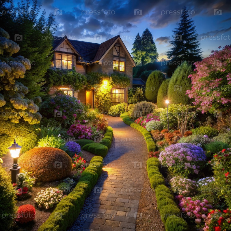 Кирпичная тропа ведет к хорошо освещенному дому в пышном саду на закате