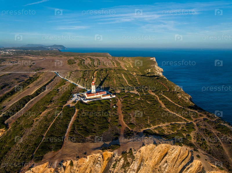Вид с воздушного дрона маяка на мысе Эспихель в Атлантическом океане