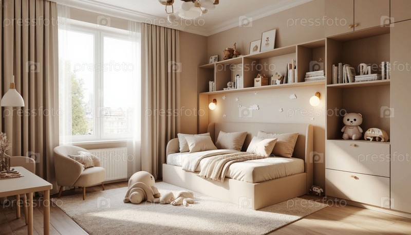 Детская спальня в пастельных цветах бежевого и белого