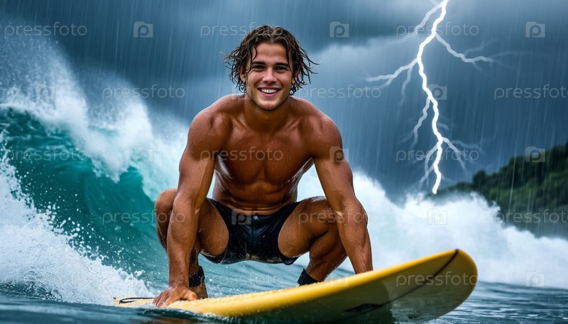 Молодой человек во время грозы и грозы с молнией в море на доске для серфинга