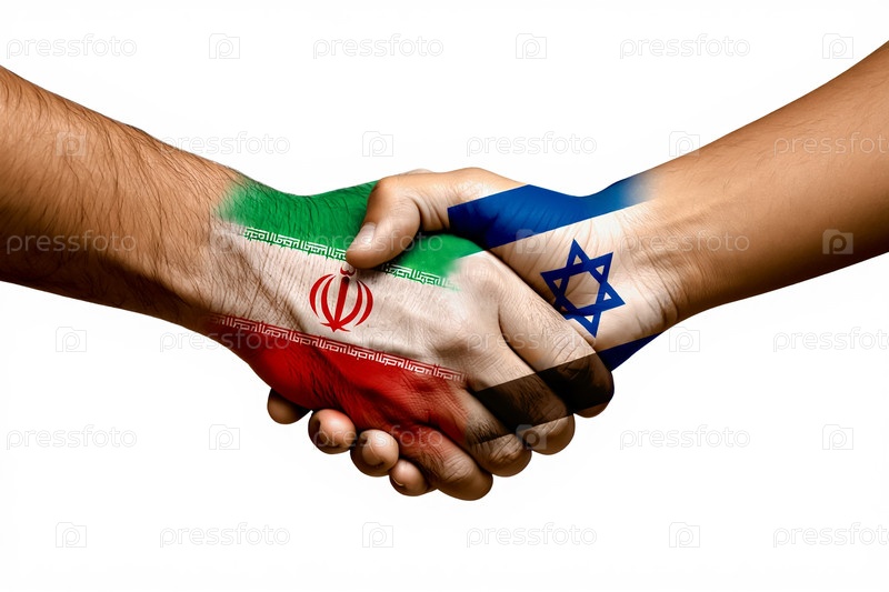 Твердое рукопожатие с флагами Израиля и Ирана - это концепция прекращения огня на Ближнем Востоке