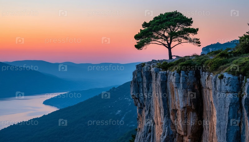 Одинокое дерево на крутой скале среди туманного утра