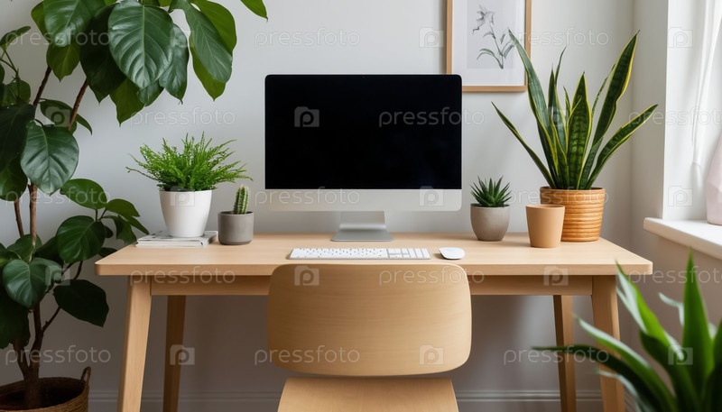 Монитор на деревянном столе против бежевой стены