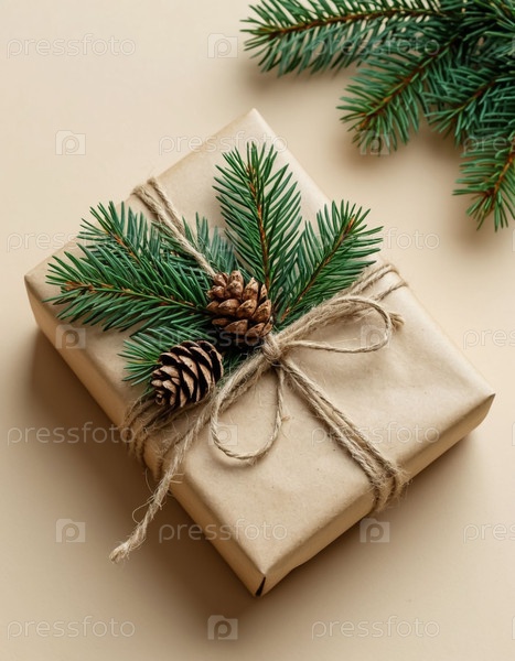 Рождественский подарок в Kraft Wrapping на бежевом фоне