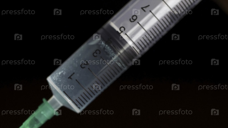 Медицинский шприц с жидкостью на черном фоне. Вода капает из иглы в шприце. Закройте ее. Рука исследователя с белой перчаткой, а цилиндр синим оттенком
