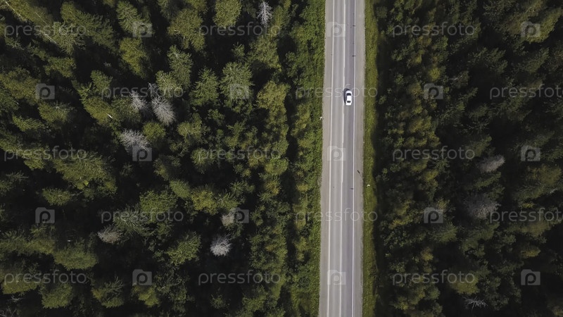 Вид с воздуха на сельскую дорогу через зеленый лес в летнее время. Стреляйте. Автомобиль приближается. Высокоугольный вид дороги, проходящей по лесу при закате солнца со пространством для авторских прав. Верхний вид асфальтированной дороги проходит через