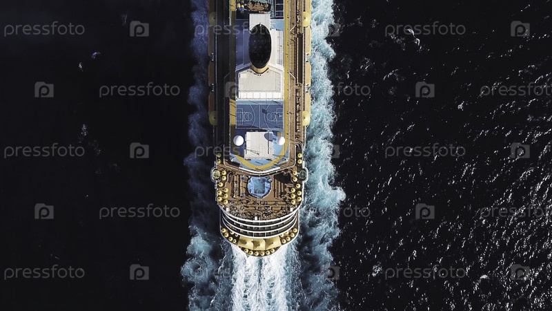 Вид с высоты птицы большого крейсера в глубокой голубой воде в солнечный день, роскошная концепция.В воздухе вид на роскошный круизный корабль с бассейнами и баскетбольным полем на борту в синем океане