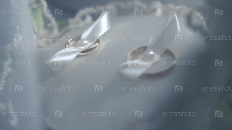 Обручальные кольца на подушке крупный план. клип. обручальные кольца, связанные белыми лентами на маленькой подушке Мягкий размытый фокус