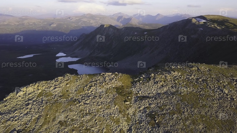 Вид из воздуха на горное озеро. Прекрасная панорама горного пейзажа с удивительным прудом. Полет квадрокоптера над горным озером