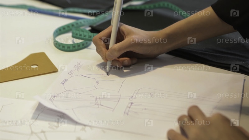Женский портной швейный материал на рабочем месте. Подготовка ткани для изготовления одежды. Хранитель, индустрия одежды, дизайнер моды эскизируют концепцию костюма и портной рисует эскизы. Концепция мастерской по проектированию. Швея на работе в стиле sm