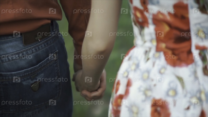 Счастливая молодая пара гуляет по Летнему Полю, держась за руки в ближайшем прогулке по широкому поле, веселясь на свежем воздухе. Клип, деревня. Мужчина и женщина на луге Мягкий размытый фокус