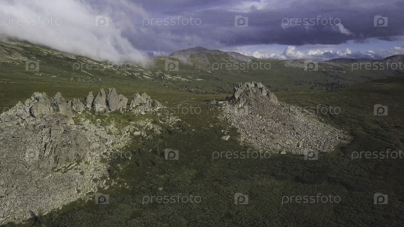 Драматический вид одинокой скалы на горных лугах с фоном солнечного света. Вид из воздуха огромной скалы на вершине горы с красивым природным фондом. Одинокая горная тропа на гребне