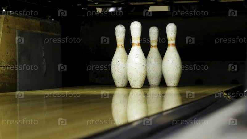 Зелёный мяч не падает в скорлупы на игровом поле, концепция активности.Закрой несколько старых белых булавок, стоящих на деревянной аллее во время игры