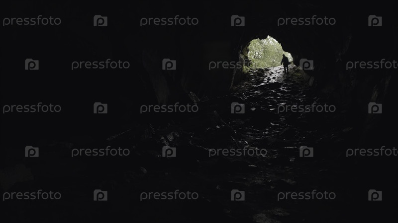 Силуэт пещерного исследователя в подземелье с входом за ним, туризм и концепция природы.Мягкий размытый фокус Мужской турист ходит внутри пещеры
