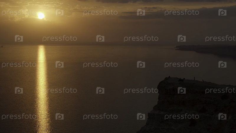 Потрясающий закат над Атлантическим океаном с ярким золотистым солнцем, нисходящим к горизонту.Снимай.Воздух тихого океана, черная скала и бронзовый закат