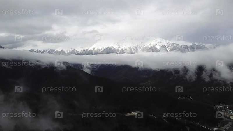 Вид с воздуха на потрясающий зимний пейзаж снежных склонов и холмов Альп среди пышных белых облаков. Резервные кадры. Летание над зеленым лесом и заснеженными вершинами в отдалении