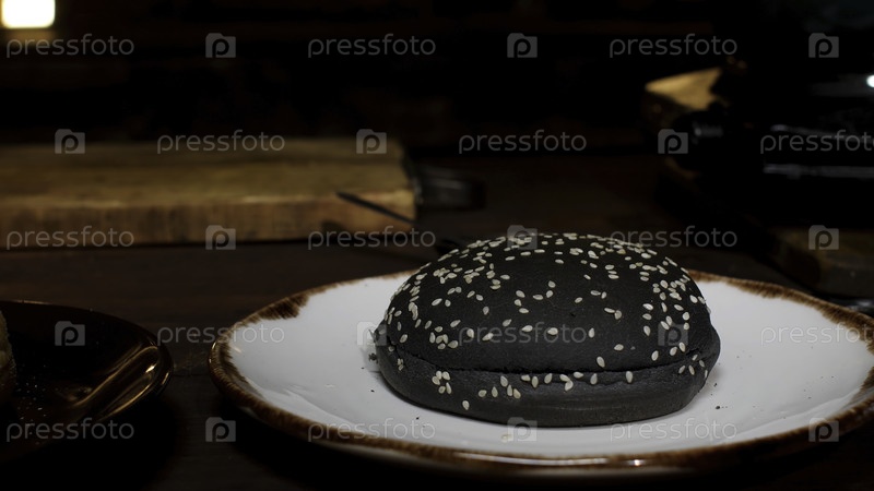 Бургерные булочки на тарелках стоят на деревянном столе в темной комнате перед приготовлением пищи.Мягкий размытый фокус Черно-белые сусамовые булочки