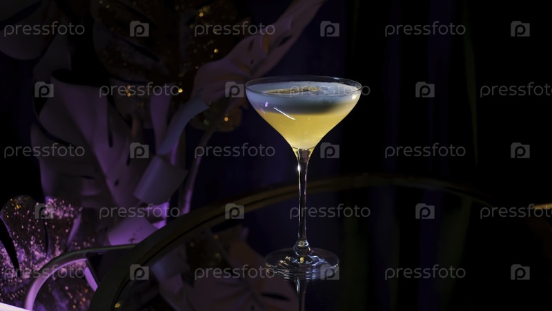 Освежающий алкогольный напиток в стакане мартини. резервные кадры. Закрытие напитка подается на стеклянном столе на черном фоне с искусственным лиловым растением