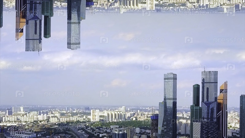 Панорамный вид на небоскребы финансового района Англии, Великобритании, эффект зеркального горизонта. резервные кадры. современные высокие здания на фоне облачного неба, тема рождения