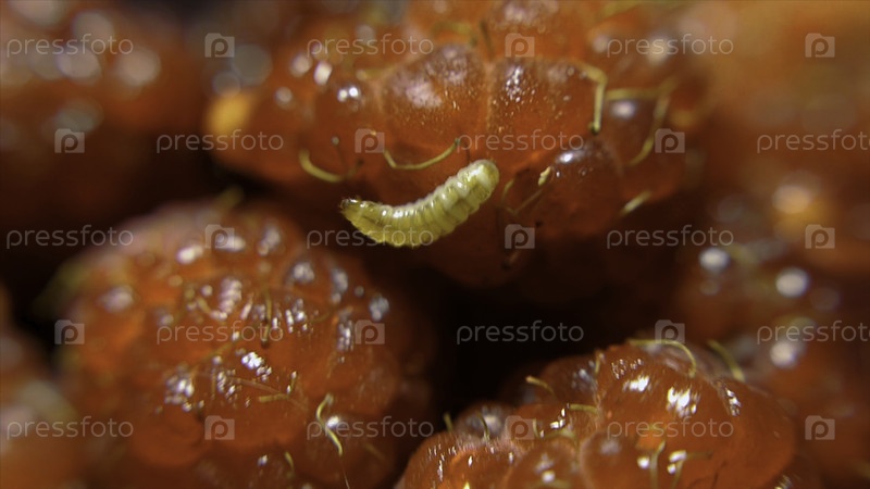 Фруктовый червь ползает в гнилые малины, кинематографический фон, макроскопия. Закройте червя на ягодах. Мягкий размытый фокус