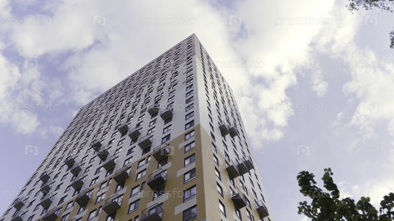 Нижний вид жилого дома на фоне голубого облачного неба.Новое жилое здание со многими квартирами и зелеными деревьями, растущими поблизости