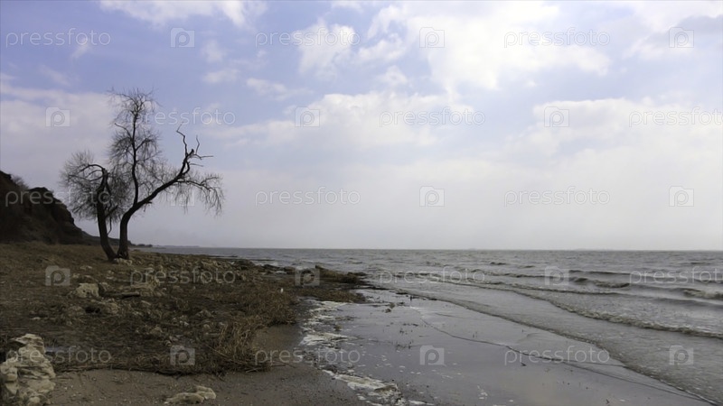 Дерево с ветвями на берегу моря, волнами и фоном неба. мертвые деревья создают позвоночник или могилу для деревьев. сухая ветка pandanus на фоне красивого морского пейзажа