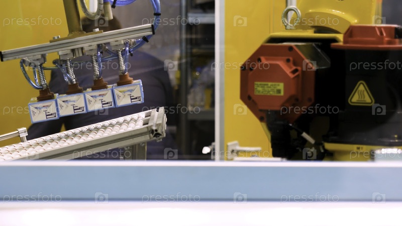 Конвейер на заводе для производства и соков в картонной упаковке.Картонные коробки переносятся рукой робота