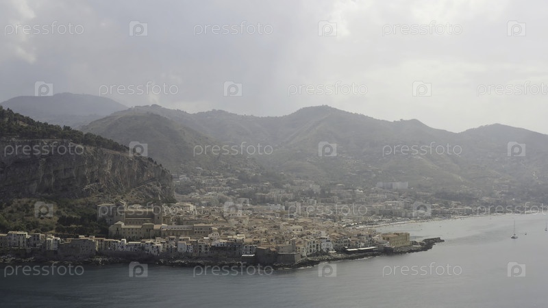 Панорамный вид прибрежного города вблизи гор на фоне облачного неба. Красивый пейзаж морского побережья и небольшого городка