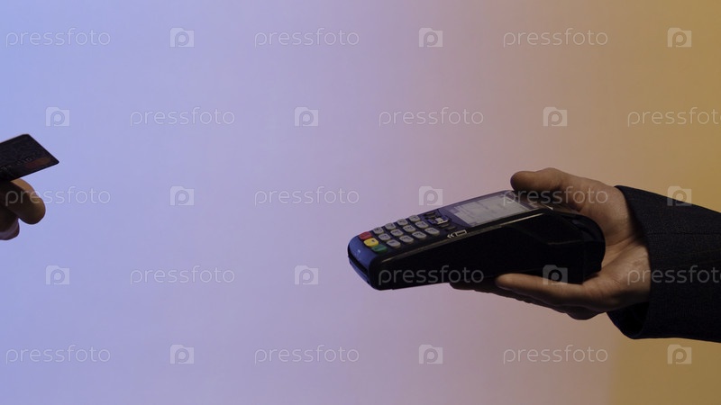 Оплата кредитной картой магнитных полос через терминал, изолированный на сине-желтом фоне