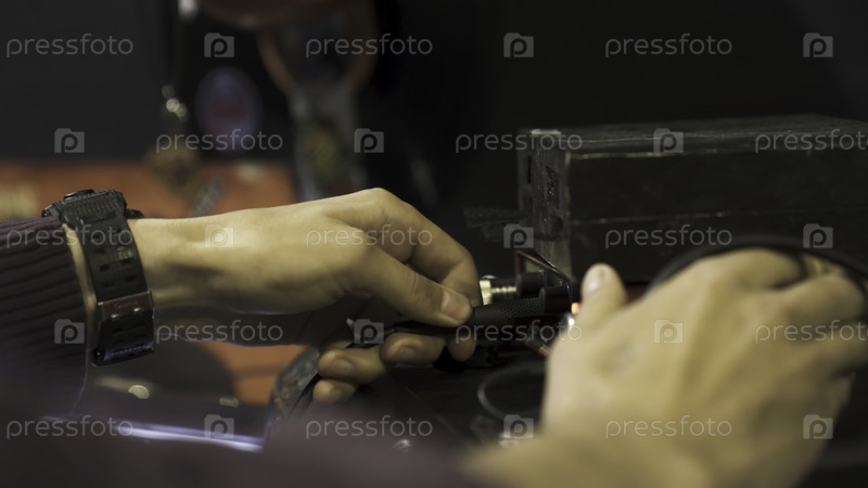 Боковой вид руки, вставляющей проволоку на переключатель. Закрыть процесс настроения звука, мужские руки регулируют элементы управления профессиональным оборудованием. Мягкий размытый фокус
