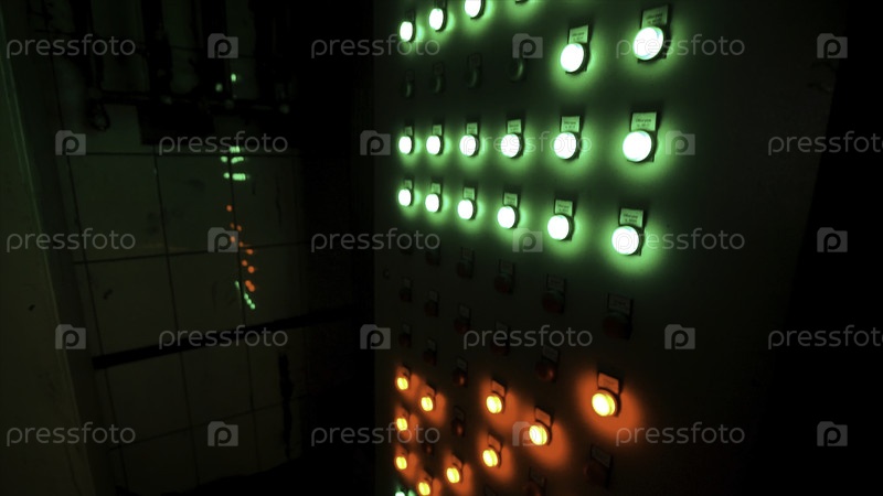 Много больших красных и зеленых кнопок на промышленной доске на фабрике.Мягкий размытый фокус Промышленная панель управления машинами нажимает кнопки в темной комнате