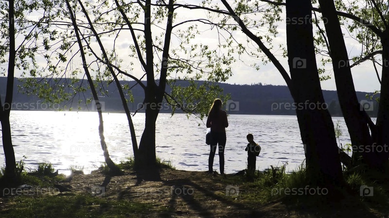 Мать и ее маленький ребенок стоят на берегу озера среди зеленых деревьев и уток в солнечный летний день, когда семья путешествует