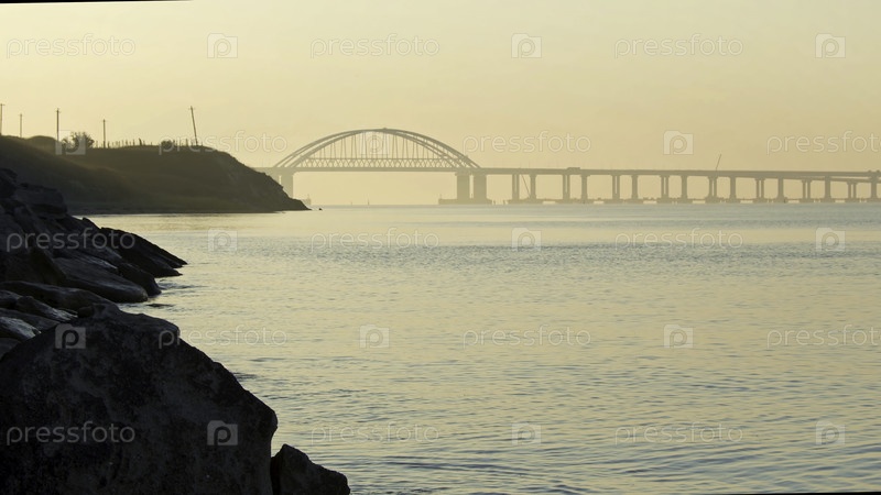 Удивительное восходящее небо над тихим морем с волнами и белым высоким мостом, красотой природы.Золотой рассвет над скалистым побережьем с эффектом расширения времени