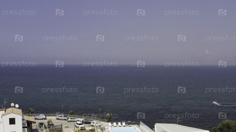 Вид с воздуха на бесконечный голубой океан и небо над дальним горизонтом, возвышающийся над домами и поверхностью воды двумя парусниками