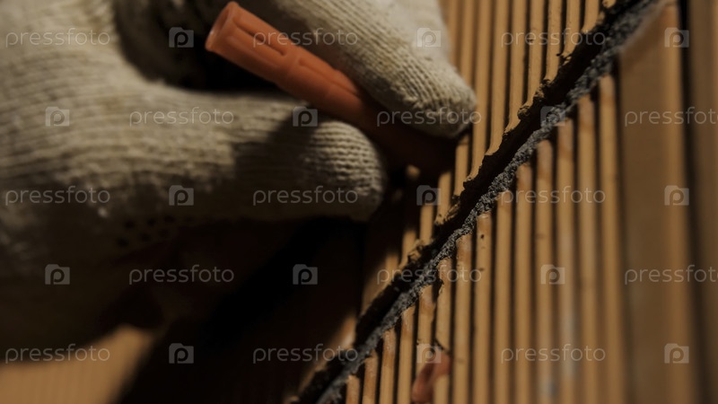 Покрывайте руки человека защитными перчатками, забивая дубинку в стену.Концепция ремонта и реконструкции, рабочие и профессиональные инструменты.Мягкий размытый фокус