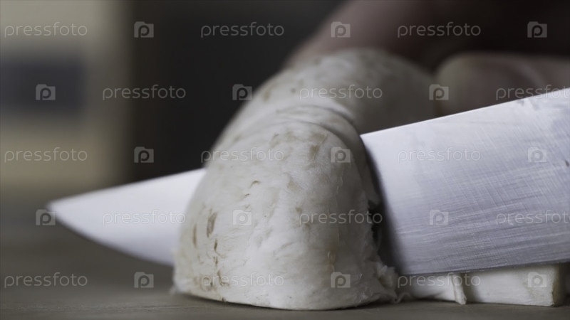 Куски грибов, близкие руки, резка грибов на равные кусочки с помощью ножа, приготовление пищи, вегетарианская диетическая концепция. лезвие ножа, разрезающее шампанское на кухне. мягкий размытый фокус