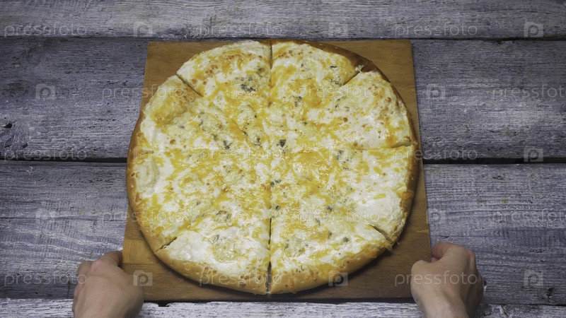 Четыре горячих сыра из вкусной пиццы лежат на подносе на деревянных серого фоновых досках