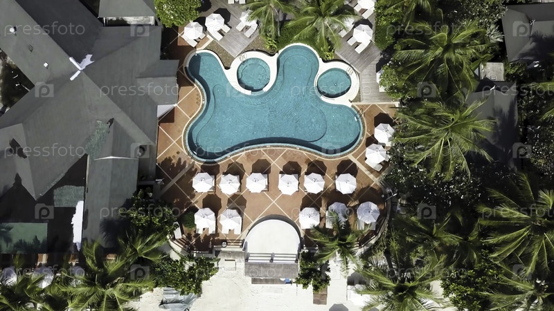 Вид с воздуха на роскошный пляжный дом с пальмами и бассейном. вид на дома на пальмском пляже, бассейн и лодку возле деревянного пирса. взгляд с воздуха сверху ландшафт